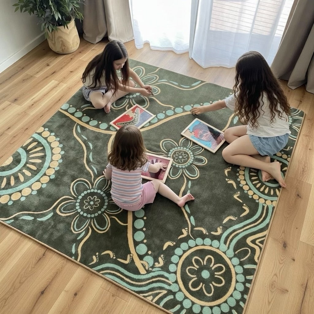• Educational Tool: The vibrant patterns and designs on the rug can be used as a visual aid to stimulate curiosity and discussions about nature, art, and Aboriginal history. It's a great resource for storytelling and group activities that support the Early Years Learning Framework (EYLF) outcomes.