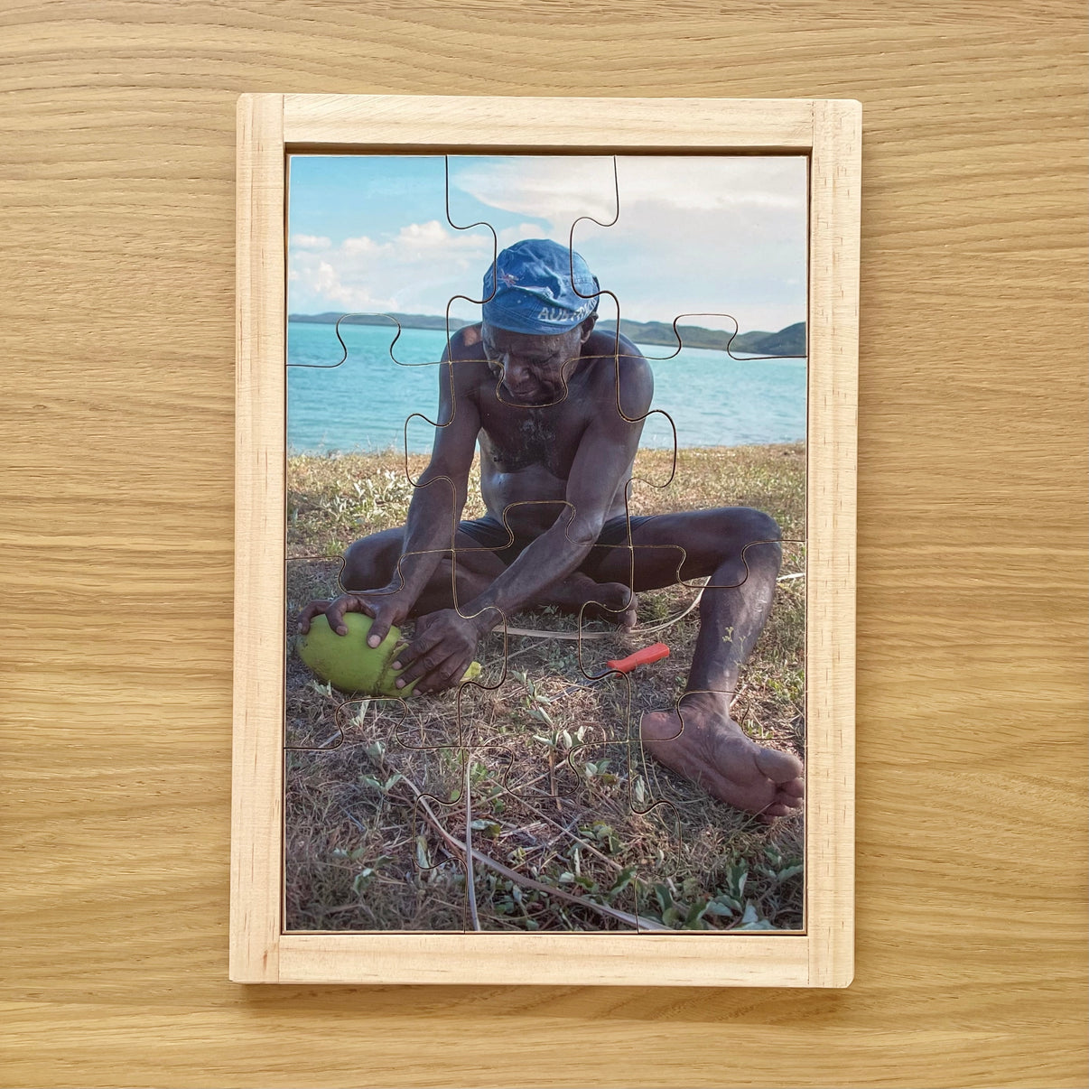 Beautifully captured and made in Australia puzzle of opening coconut by a Torres Strait Islander.