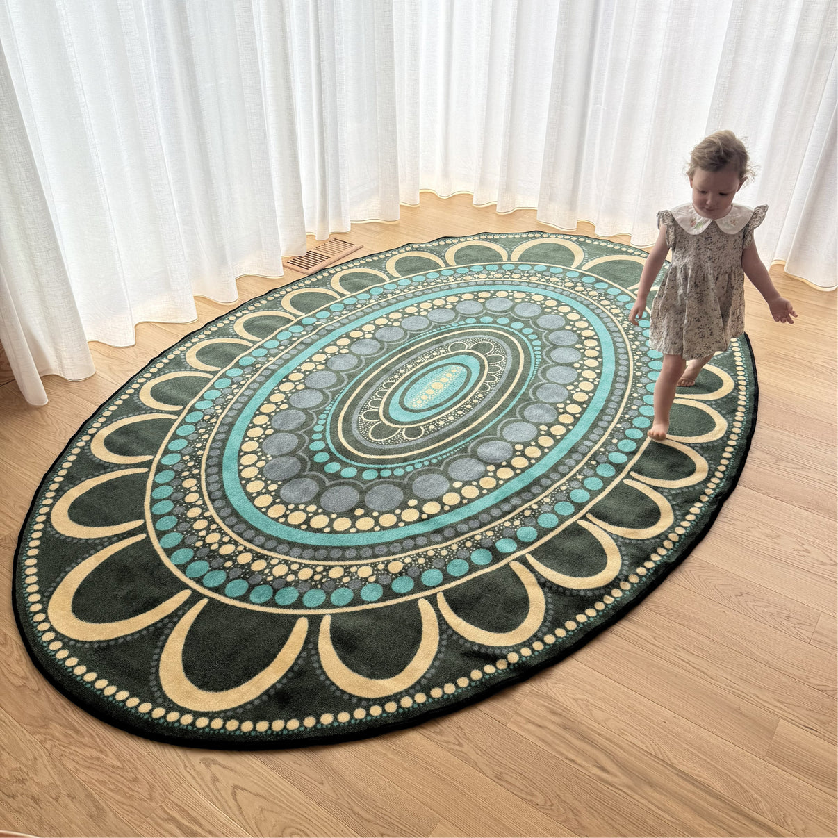 We designed it so that all the children could sit and have a yarn together. 2.1m x 3.1m and oval in shape is enough space for all.