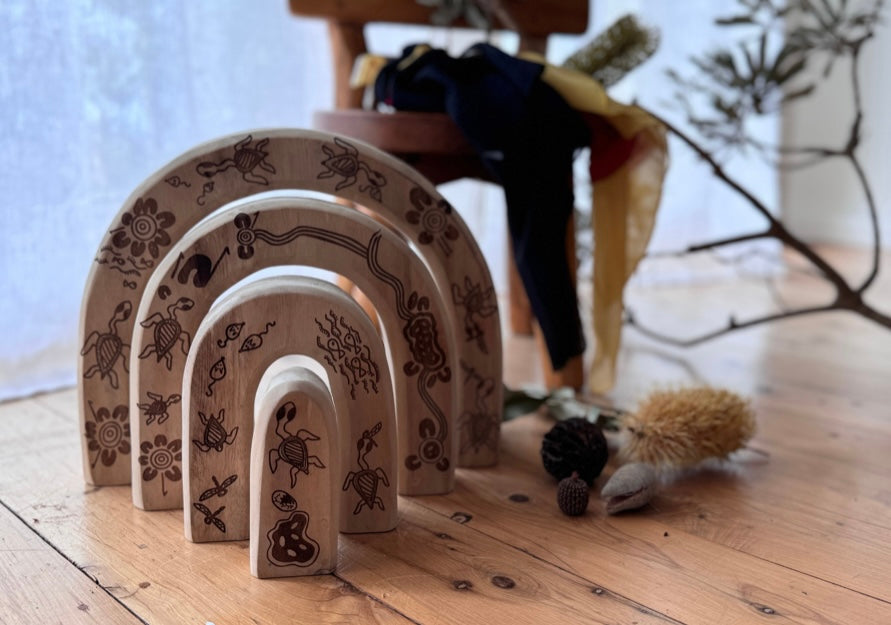 An educationally rich and authentic resource designed by emerging Aboriginal Artist; proud Ballardong and Menang woman, Simone Hills. This resource explores the journey of the long necked turtle (Yaakan) and their connection with people. Featuring an arch design with 4 pieces it is the perfect resource for little hands, developing a connection to culture and embedding Aboriginal perspectives in all early learning environments. Simone Hills - Karda Artwork is an Artist Member of the Indigenous Art Code This means as an artist Simone is adding am adding her voice to the call for fair and ethical trade with Aboriginal and Torres Strait Islander artists, and transparency in the promotion and sale of artwork.